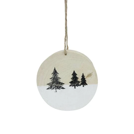 This wonderful wood ornament lends a cabin feel by adding that rustic touch to your holiday décor. Features a snowy backdrop for the three pine trees in the forefront bringing in the outdoors into your décor. Perfect on your Christmas tree hang from your mantel or added to a gift in place of a bow.